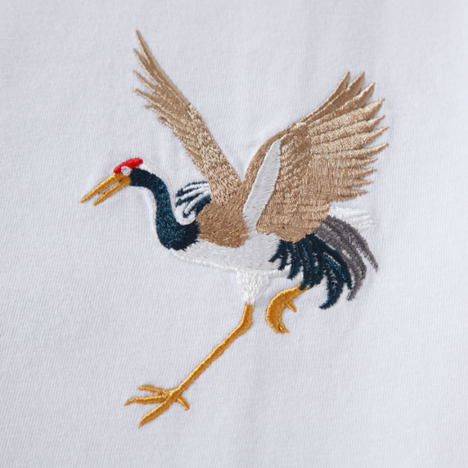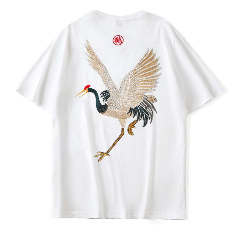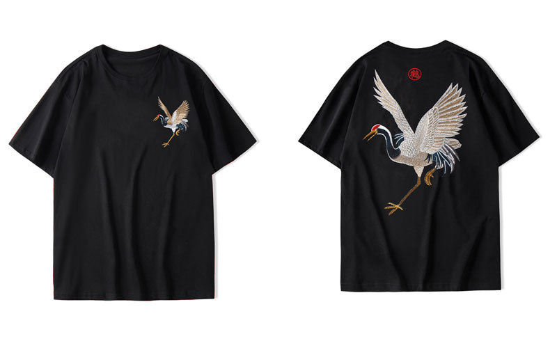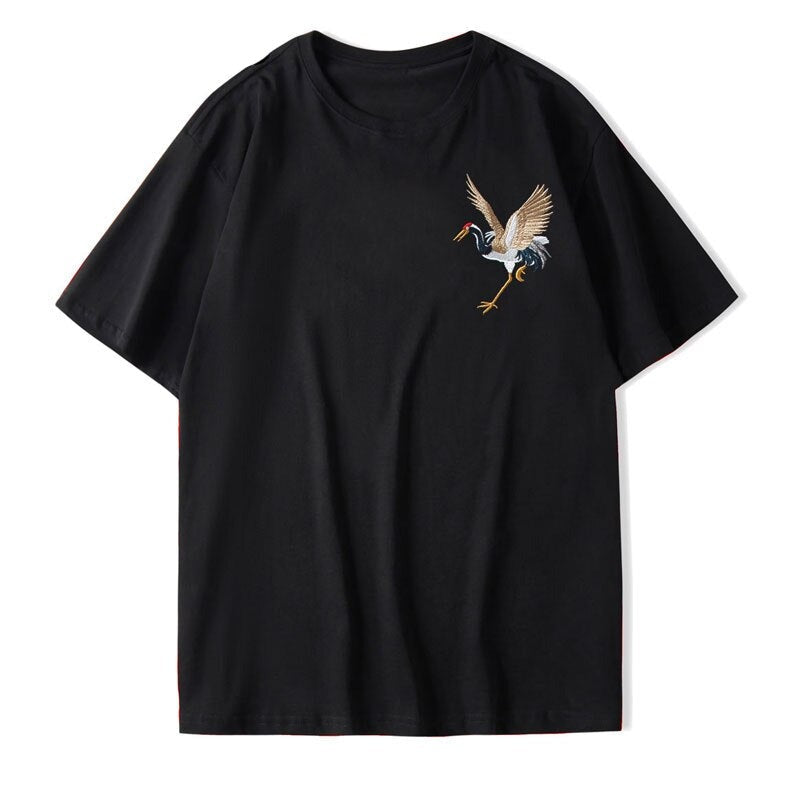 -T-shirt Noir Manches courtes Oversize Oiseau Grue Blanche Brodé Streetwear