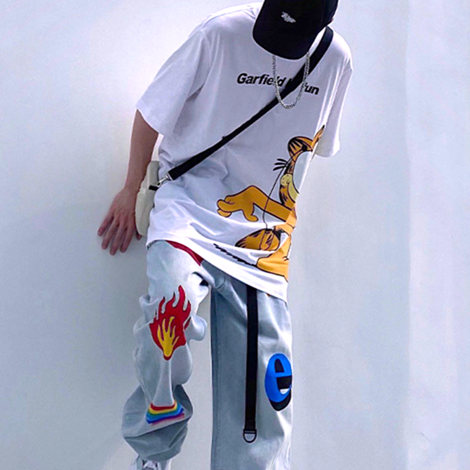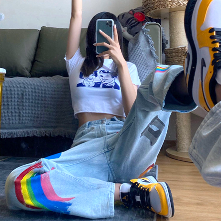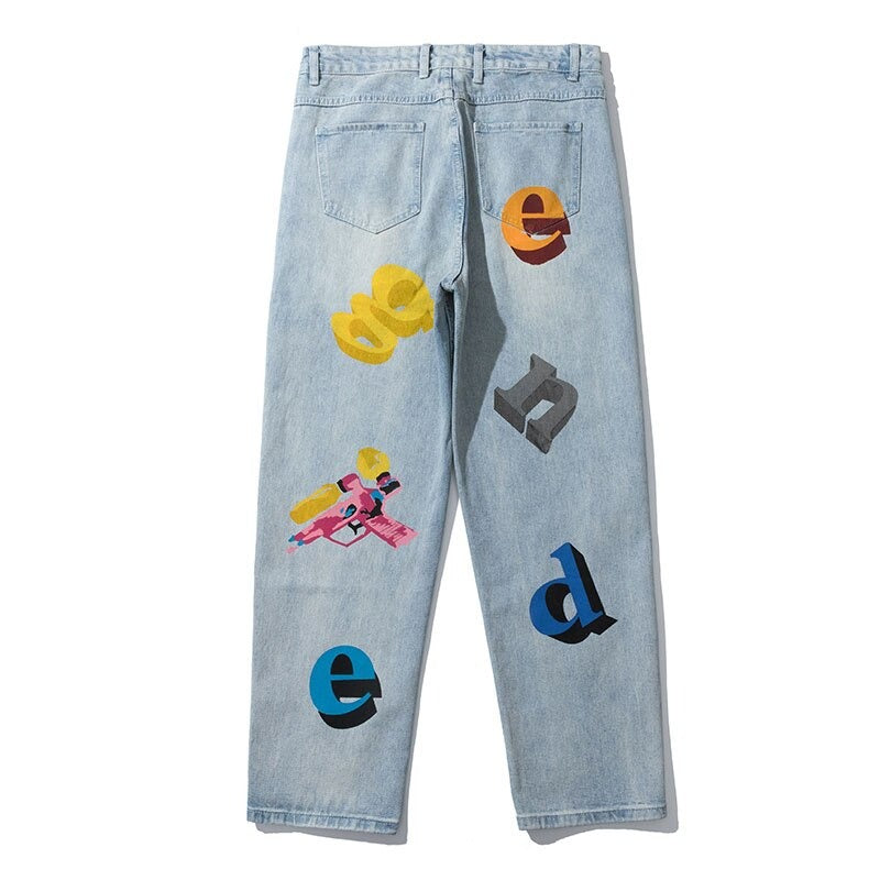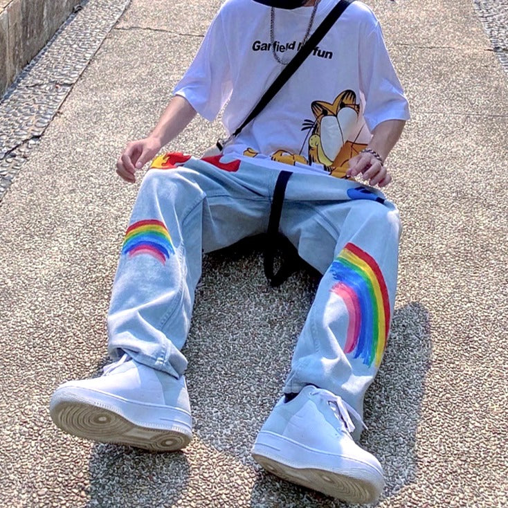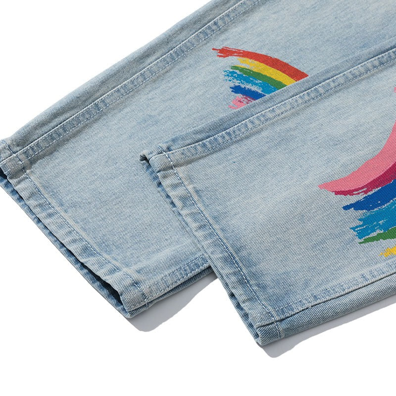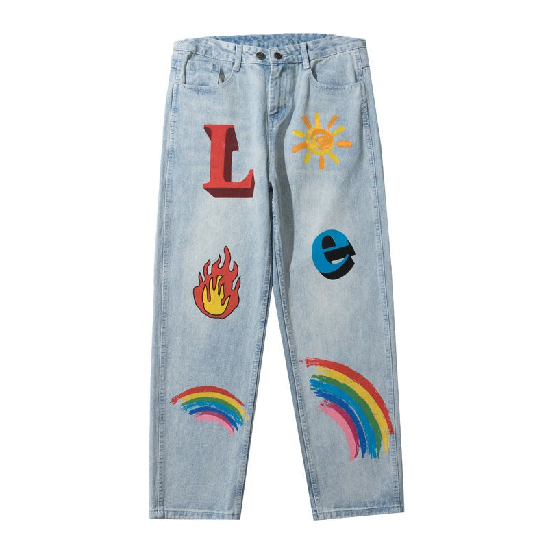 -Jean Denim Large Coupe droite à Imprimés Flammes, Arc en Ciel, Lettres