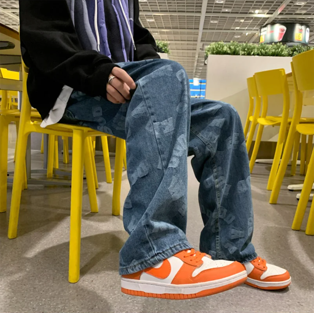 -Jean Large Denim Loose Imprimé Coupe Droite Ample Streetwear