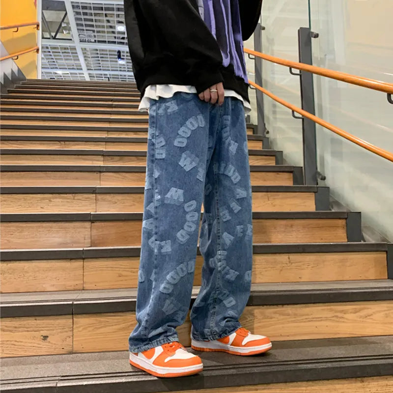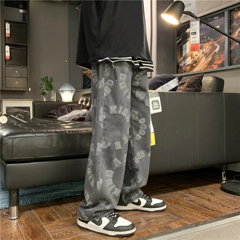 -Jean Large Denim Loose Imprimé Coupe Droite Ample Streetwear