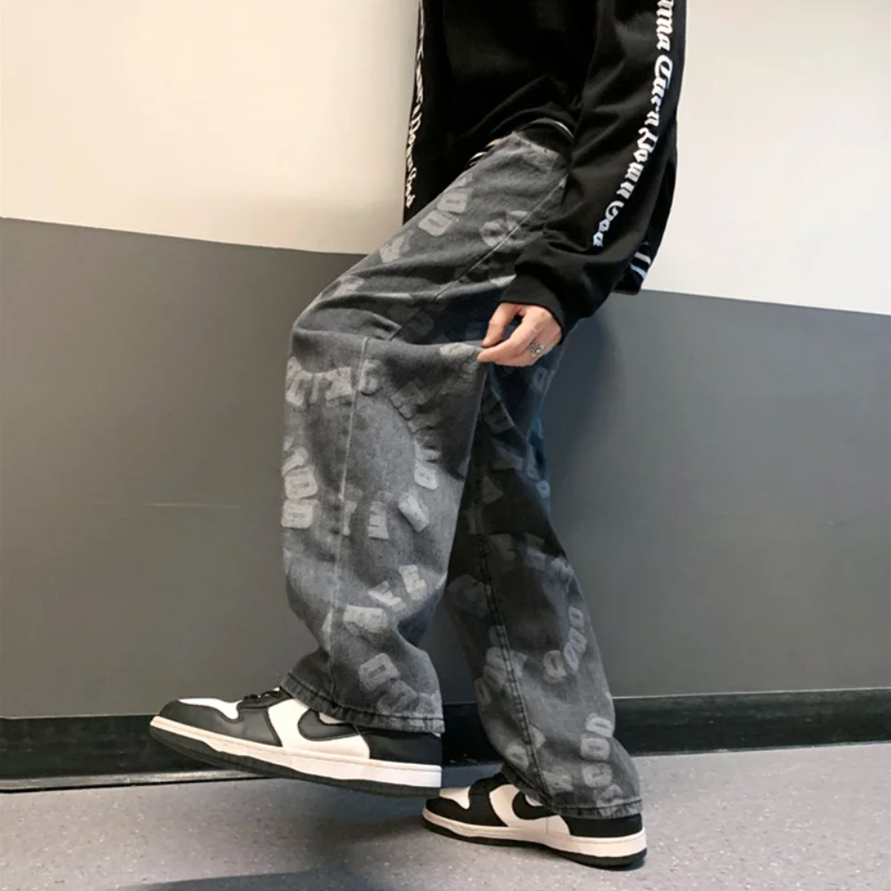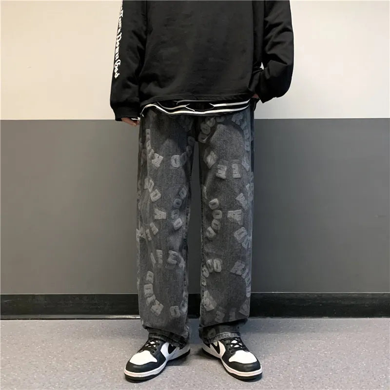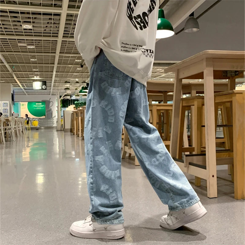 -Jean Large Denim Loose Imprimé Coupe Droite Ample Streetwear