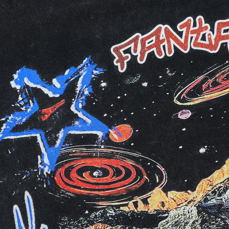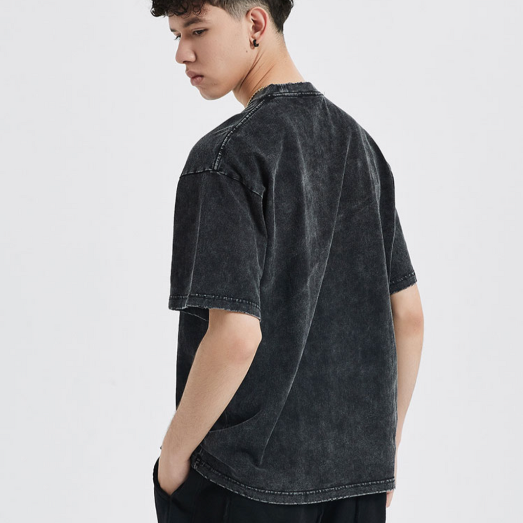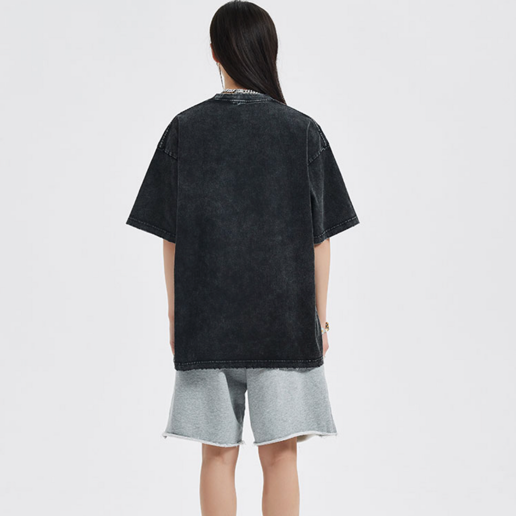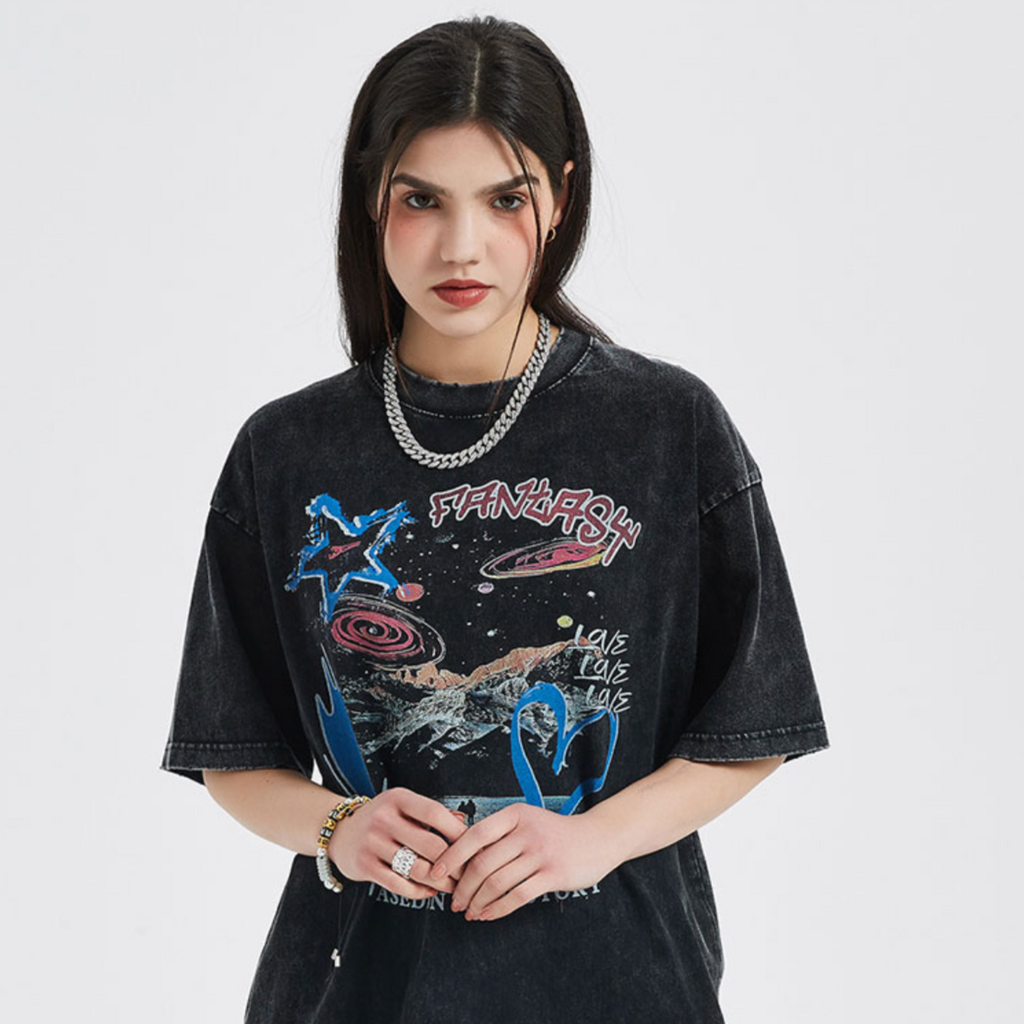 -T-shirt Noir Délavé Oversize Imprimé Rétro Streetwear