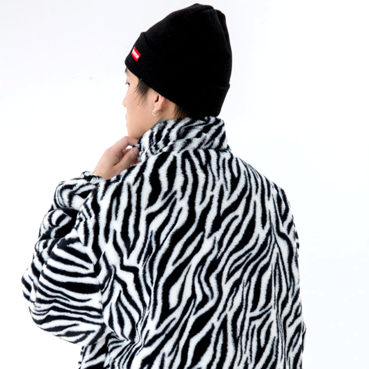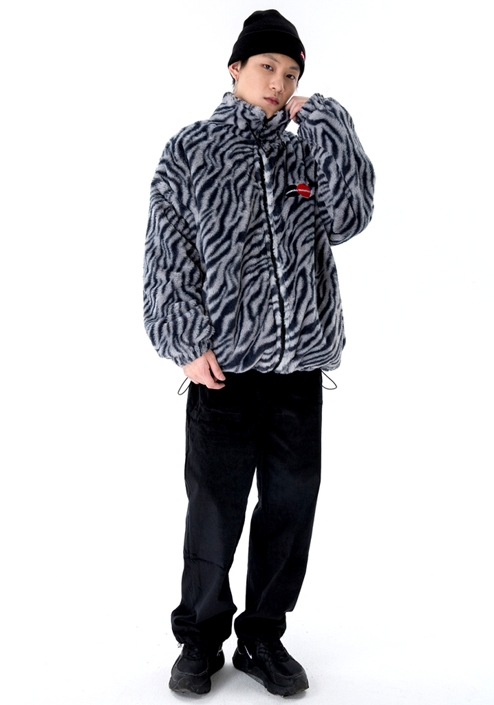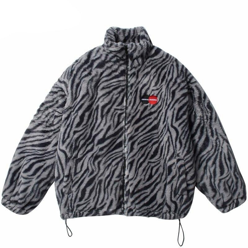 -Pull Gilet à Zip Fourrure Zébré Gris Molletonné Oversize Streetwear