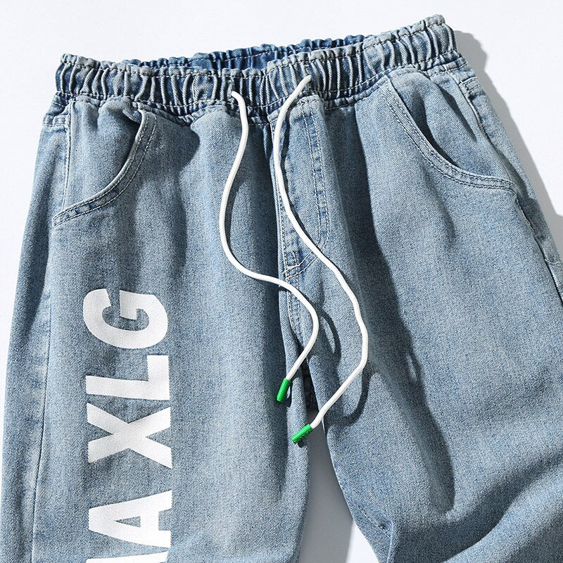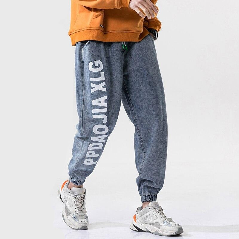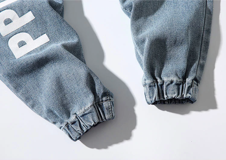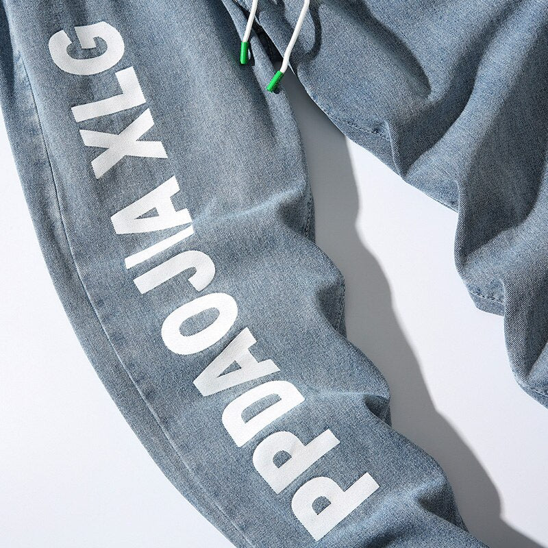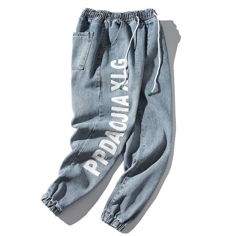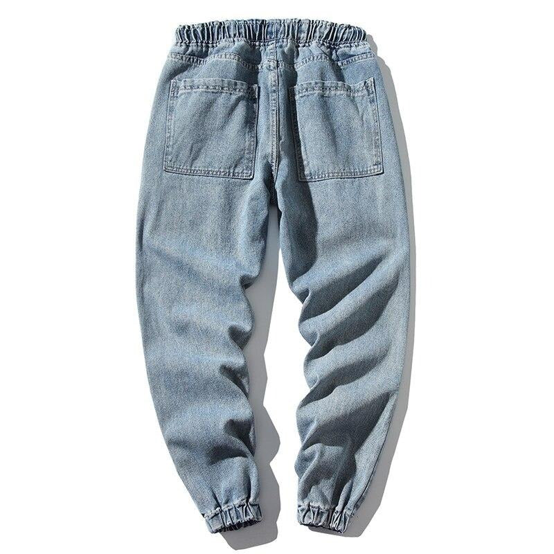 -Pantalon Jean Jogger Denim Cargo Streetwear Bleu Homme Femme